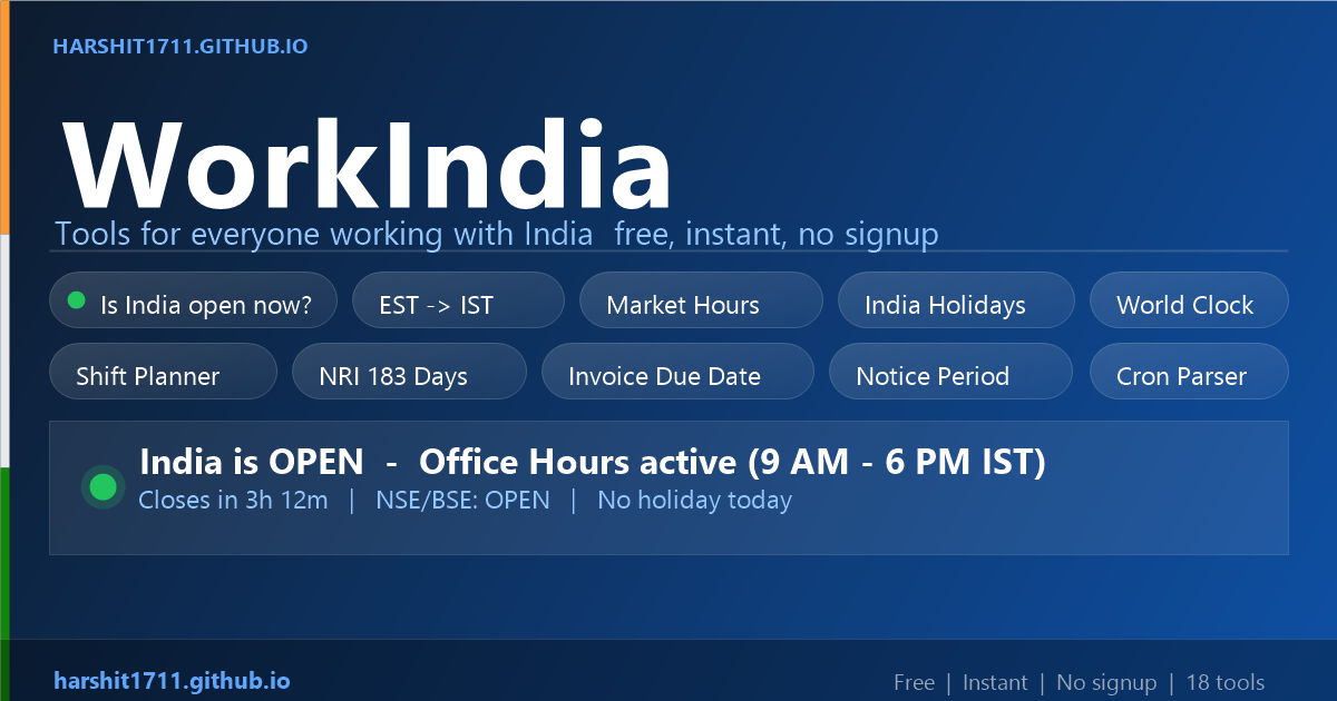 India working hours globally: 9 AM–6 PM IST = 10:30 PM?7:30 AM EST = 7:30 PM?4:30 AM PST = 3:30 AM?12:30 PM GMT = 4:30 AM?1:30 PM CET.